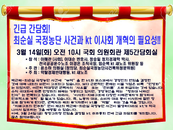 [초대] 최순실 국정농단 사건과 kt 이사회 개혁을 위한 긴급 간담회 KT새노조2017.03.08소식Leave a Comment [초대] 최순실 국정농단 사건과 kt 이사회 개혁을 위한 긴급 간담회 관련