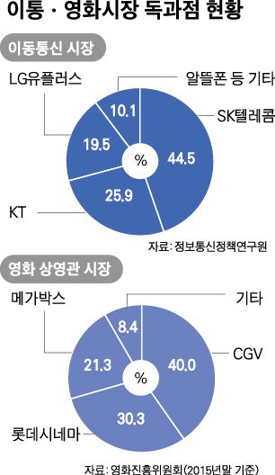 영화 시장도 비슷하다. CGVㆍ롯데시네마ㆍ메가박스 등 3개 대형 멀티플렉스(여러 개의 스크린을 보유한 복합상영관) 회사들이 전체 스크린의 90% 이상을 점유하고 있다. 영화 산업의 독과점 문제는 문재인 대통령도 언급한 적이 있다. 문 대통령은 선거운동 기간 중 엔터테인먼트 업계 관계자들을 만나 “지금은 배급사가 전체를 좌지우지하고 대형 제작사가 배급망까지 함께 갖고 있다”며 “그쪽과 손잡지 못하는 영화는 열심히 제작해도 상영 기회를 갖지 못한다”고 양극화 문제를 지적했다.